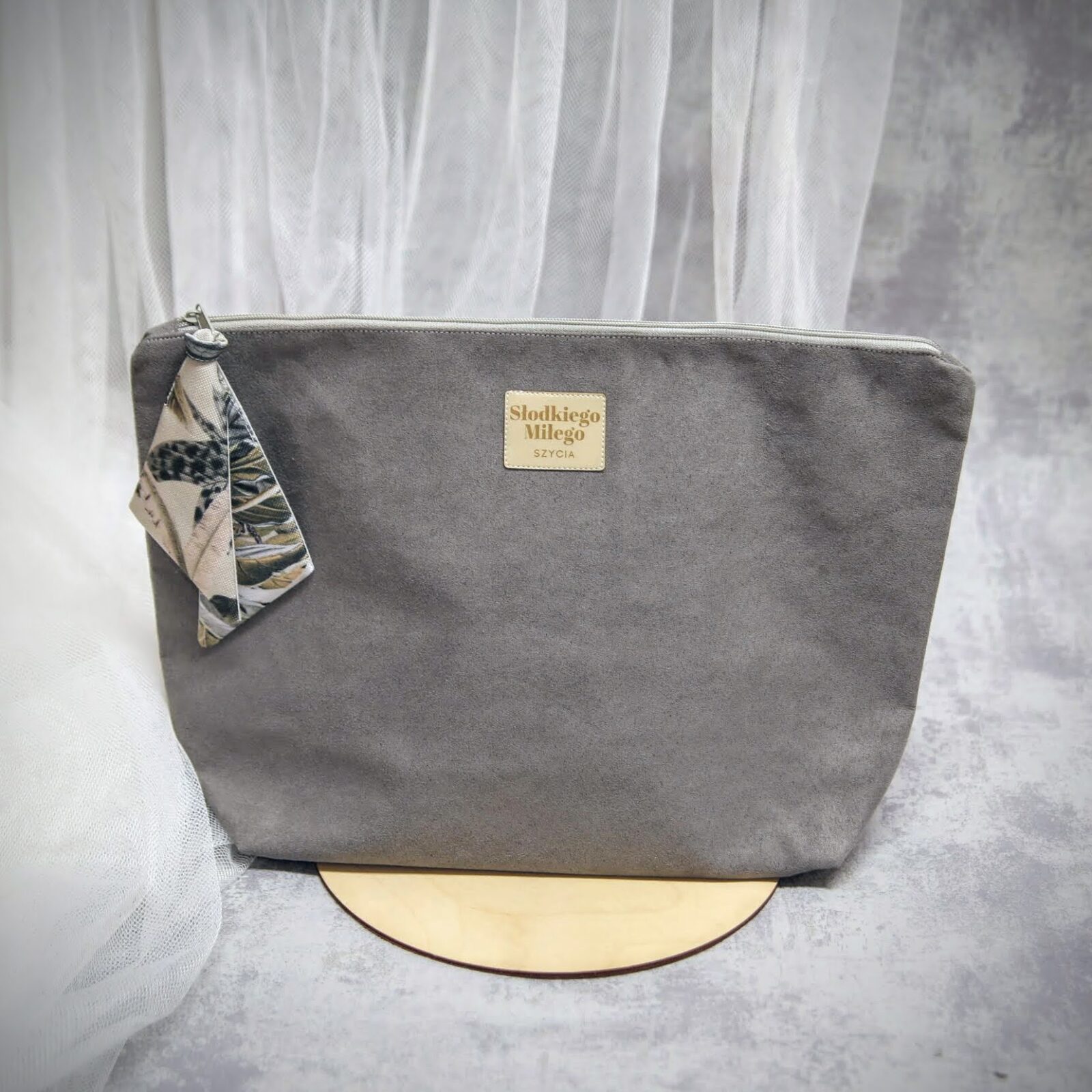 Duża, pojemna kosmetyczka wykonana z nubuku z zewnątrz i bawełnianą podszewką wewnątrz. Idealna do przechowywania kosmetyków, akcesoriów dziecięcych czy drobiazgów w podróży. W środku kieszonka na zamek. Ręcznie szyta w Polsce z dbałością o każdy detal.