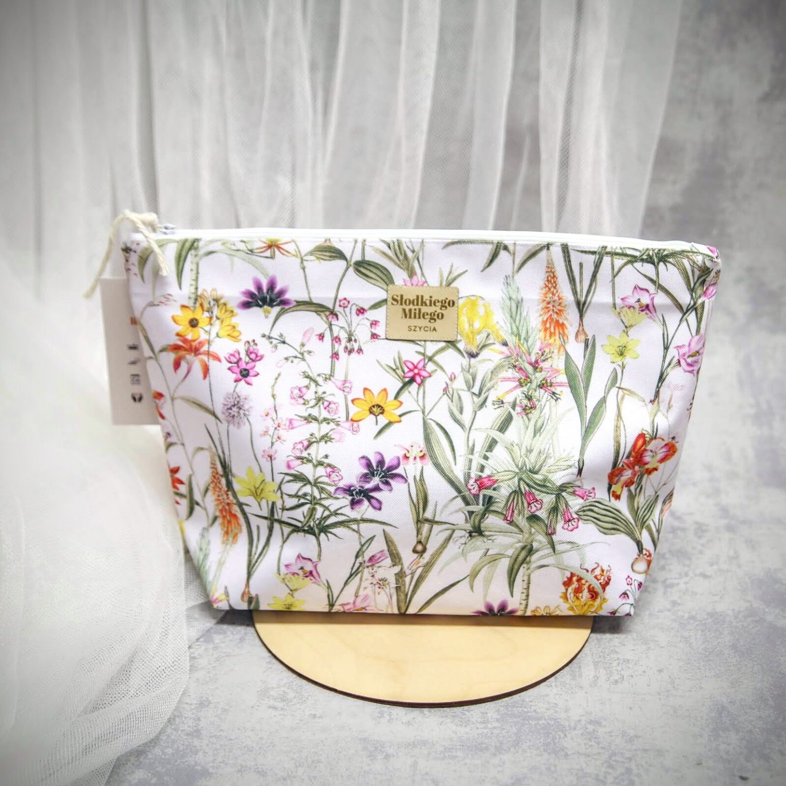Duża, pojemna kosmetyczka wykonana z wodoodpornej tkaniny z zewnątrz i bawełnianą podszewką wewnątrz. Idealna do przechowywania kosmetyków, akcesoriów dziecięcych czy drobiazgów w podróży. W środku kieszonka na zamek. Ręcznie szyta w Polsce z dbałością o każdy detal.