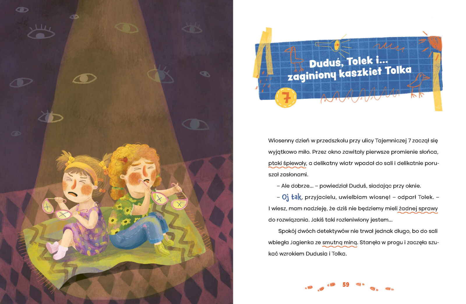 „Duduś i Tolek na tropie” to pełna humoru i tajemnic opowieść o dwóch pięcioletnich detektywach, którzy prowadzą swoją Agencję Detektywistyczną w przedszkolu przy ul. Tajemniczej 7.