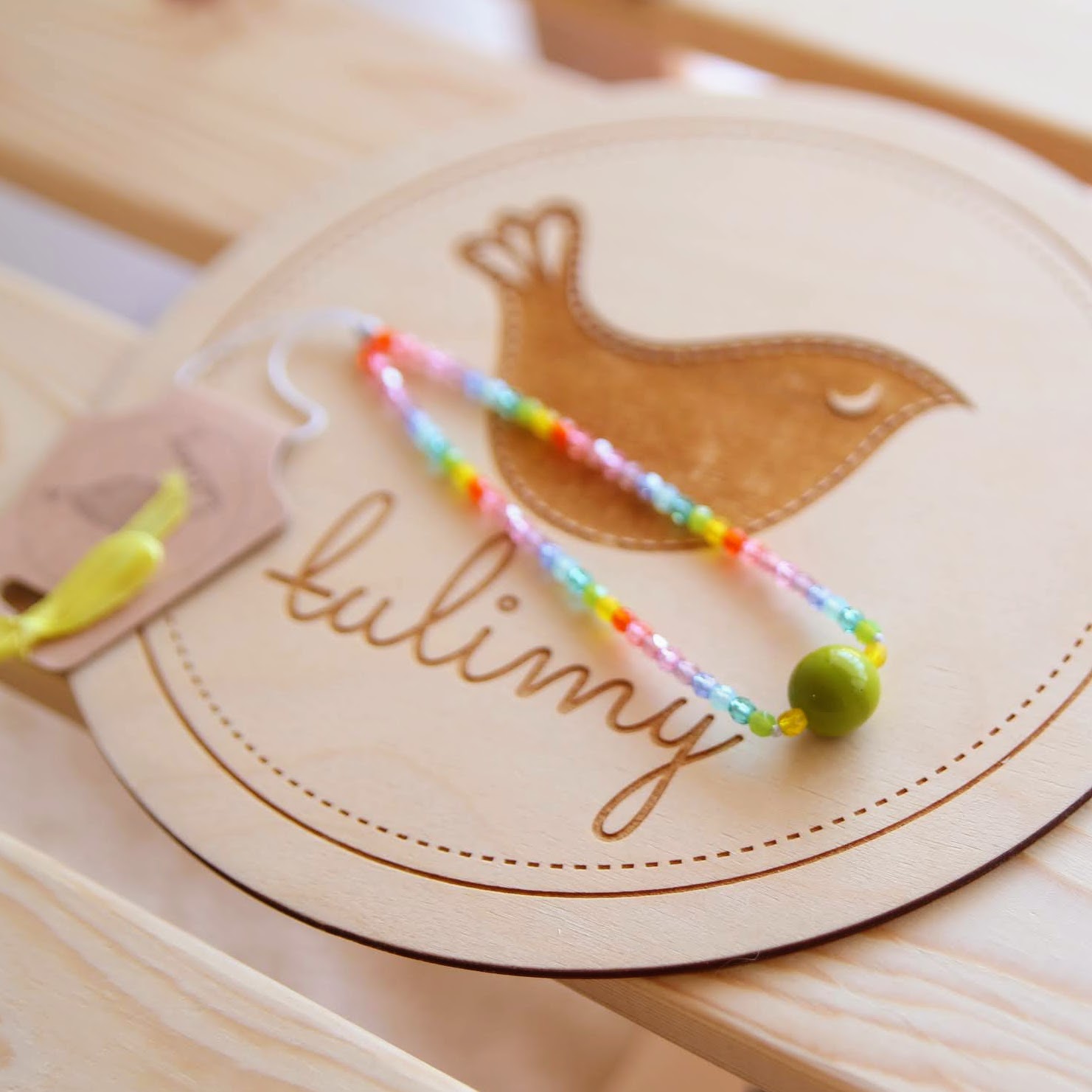 materiał bazy – sznurek poliestrowy; pozostałe materiały – koraliki szklane, element ceramiczny; produkt nie posiada elementów metalowych; obwód części mocującej: ok. 10-12cm; obwód głównego elementu z koralikami: ok. 25cm.